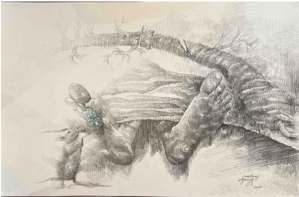 In “Over Nature’s Dead Body,” Agoreyo utilizes charcoal to create a stark, monochromatic scene that is both haunting and contemplative. The painting features a corpse laid upon the earth, with tree roots intertwining through the body, symbolizing the cycle of life and death. The presence of a rat gnawing at the feet adds a grim reminder of nature’s relentless cycle. This piece poignantly illustrates the inevitability of death and our return to the earth, suggesting that even in death, we contribute to the natural world. The image compels viewers to reflect on mortality and the enduring impact of our physical forms on the environment.