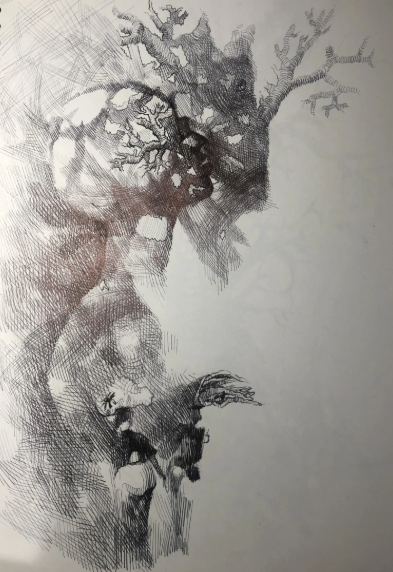 In “Grasping for Death,” Agoreyo ventures into the realm of the surreal with an alien-like form adorned with growing trees. This piece, also rendered in charcoal, diverges significantly from his previous thematic expressions, showcasing his versatility and willingness to explore new artistic territories. The otherworldly figure and the organic elements intertwined with it suggest a symbiosis between life and death, nature and the unknown. The painting’s abstract nature encourages viewers to interpret its meaning, potentially reflecting on the alienation from or integration with the natural world in the face of mortality.